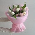 Букет из розовых диантусов и кустовых пионовидных роз Бомбастик в упаковке
