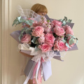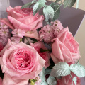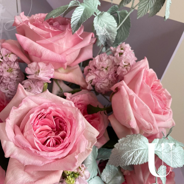 Букет из роз Пинк Мондиаль, диантусов Мун Аква и маттиол в лавандовой упаковке