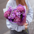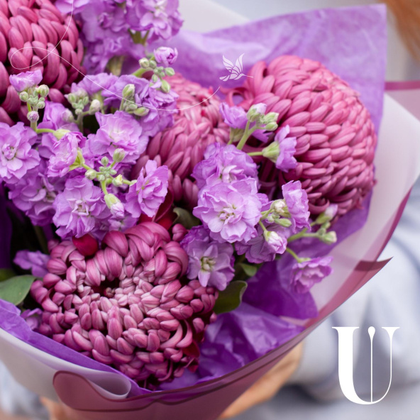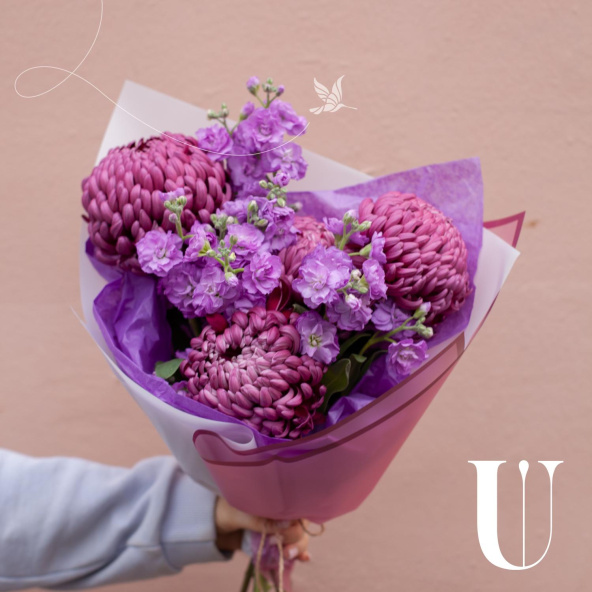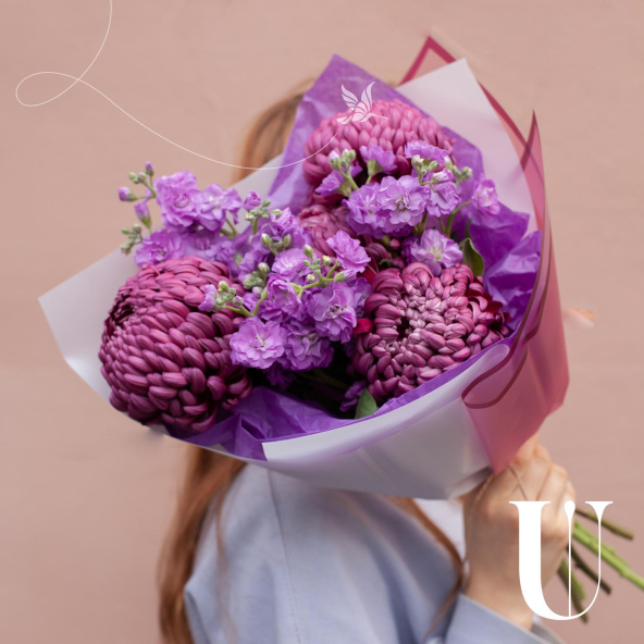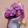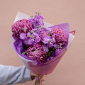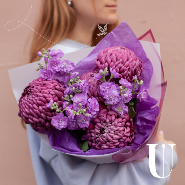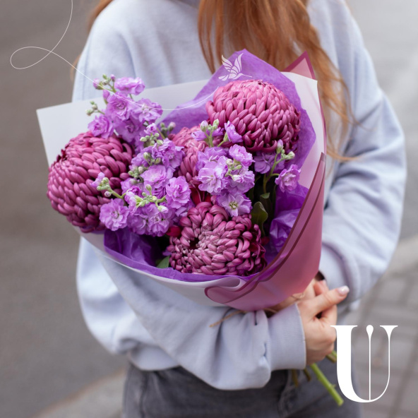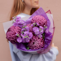 Букет с кустовой хризантемой, кустовой розы, кремового диантуса в дизайнерской упаковке