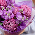 Букет из белых кустовых хризантем, розовых гвоздик в дизайнерской упаковке