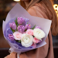 Дуо-букет из пионовидных и французских роз в стильной серой упаковке