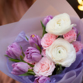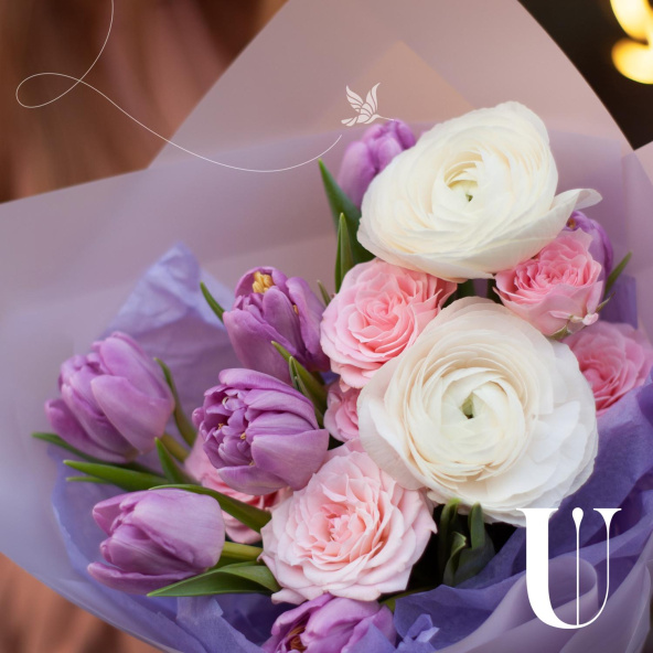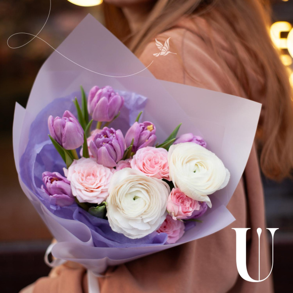 Стильная композиция из сиреневых и белых роз в дизайнерской упаковке