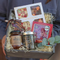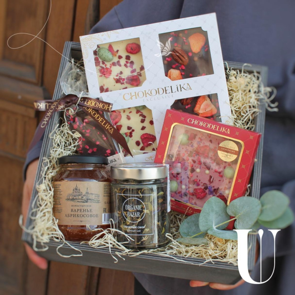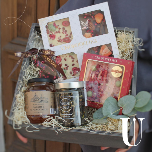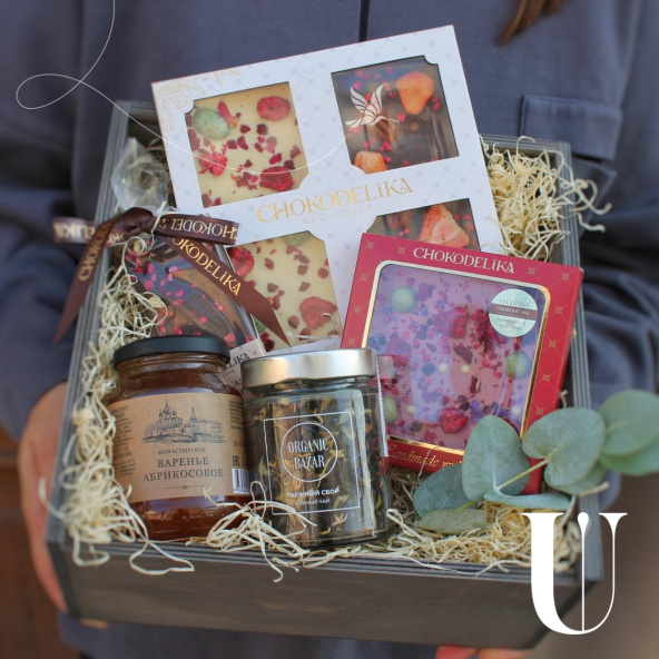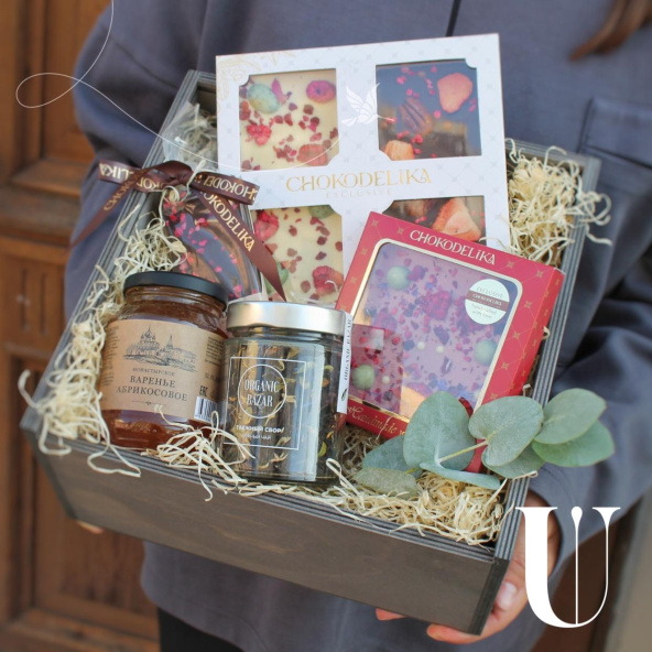 Упаковка - 1 шт. Деревянный ящик - 1 шт. Шоколад ручной работы - 50 гр. шоколад ручной работы мини - 1 шт. чай в банке - 54 гр. варенье абрикосовое - 300 гр. шоколад ручной работы макси - 200 гр.