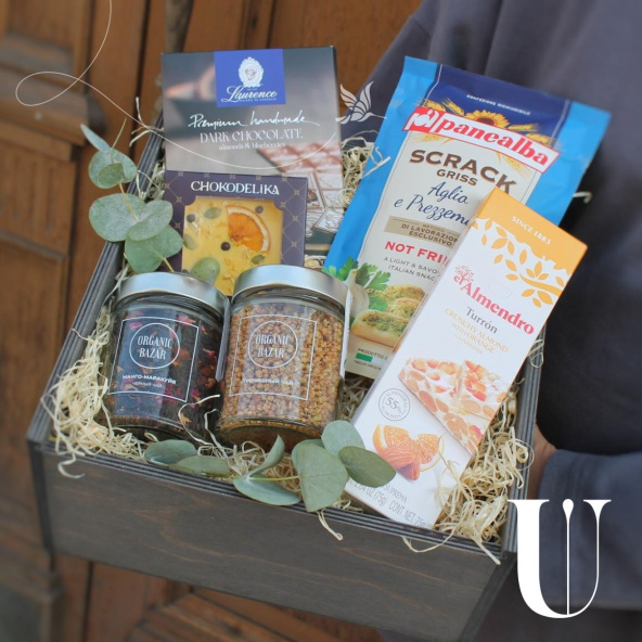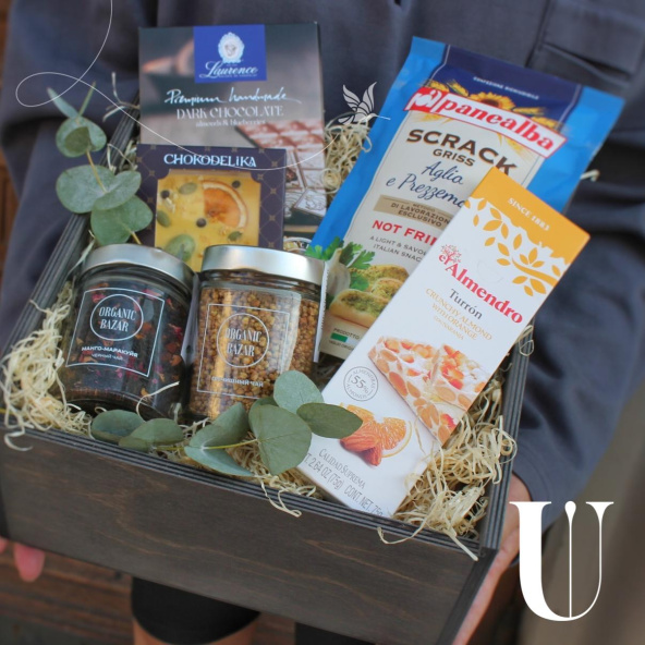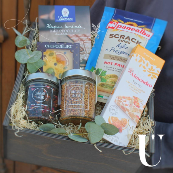 Упаковка - 1 шт. Деревянный ящик - 1 шт. Шоколад ручной работы - 50 гр. чай в банке - 55 гр. туррон - 75 гр. шоколад лауренце - 80 гр. чай гречишный в банке - 97 гр. хлебные палочки скрек - 100 гр.