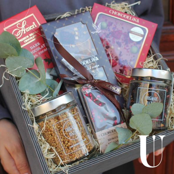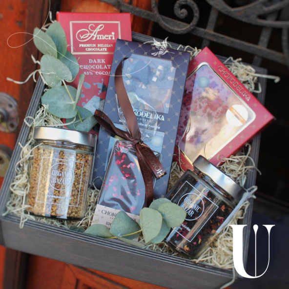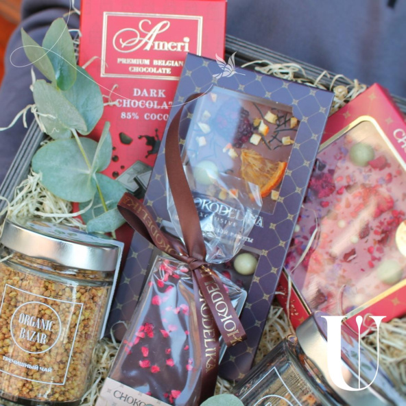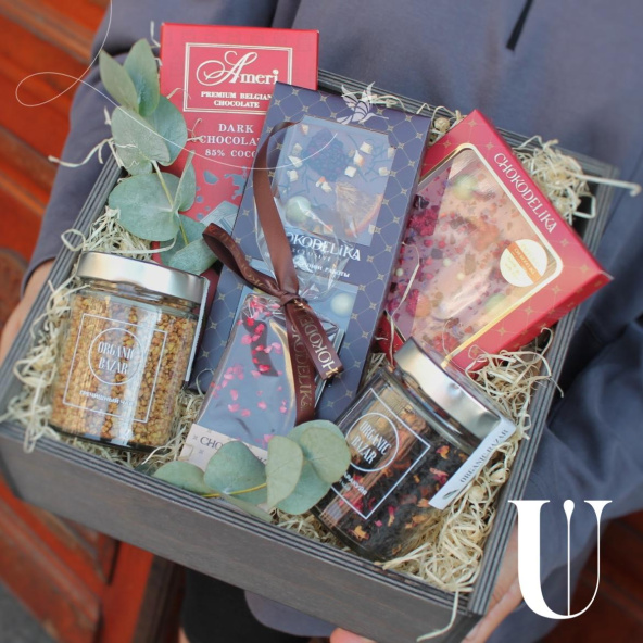 Упаковка - 1 шт. Деревянный ящик - 1 шт. Шоколад ручной работы - 100 гр. шоколад ручной работы мини - 1 шт. чай в банке - 55 гр. шоколад амери - 100 гр. чай гречишный в банке - 97 гр.