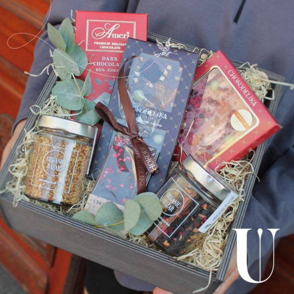Подарочный набор из шоколада ручной работы, чая и хлебцов в деревянном ящике