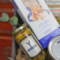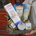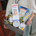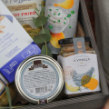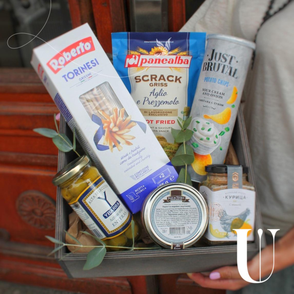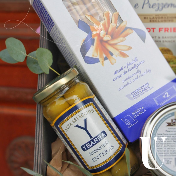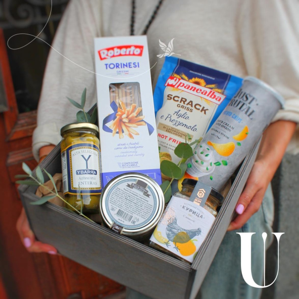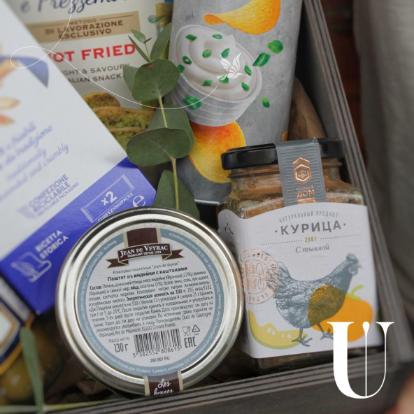 Упаковка - 1 шт. Деревянный ящик - 1 шт. оливки в банке - 240 гр. паштет жан де вейрак - 130 гр. хлебные палочки гриссини - 125 гр. хлебные палочки скрек - 100 гр. курица медовый дом - 250 гр. чипсы в тубе - 100 гр.