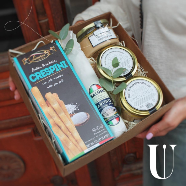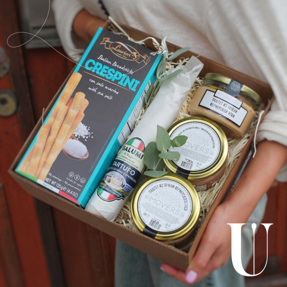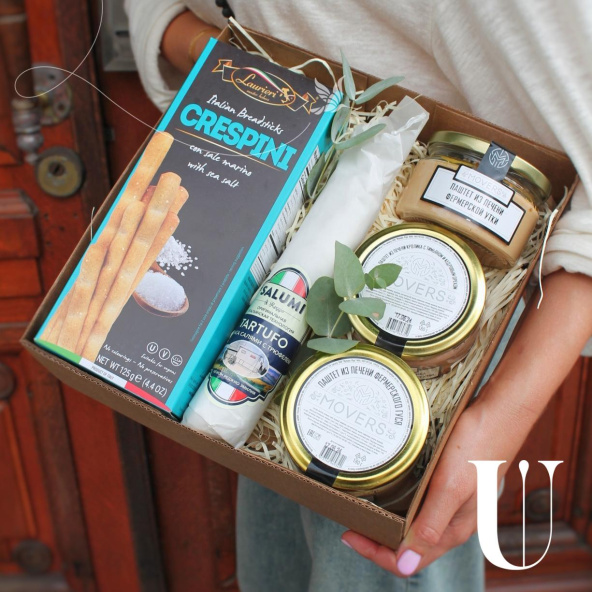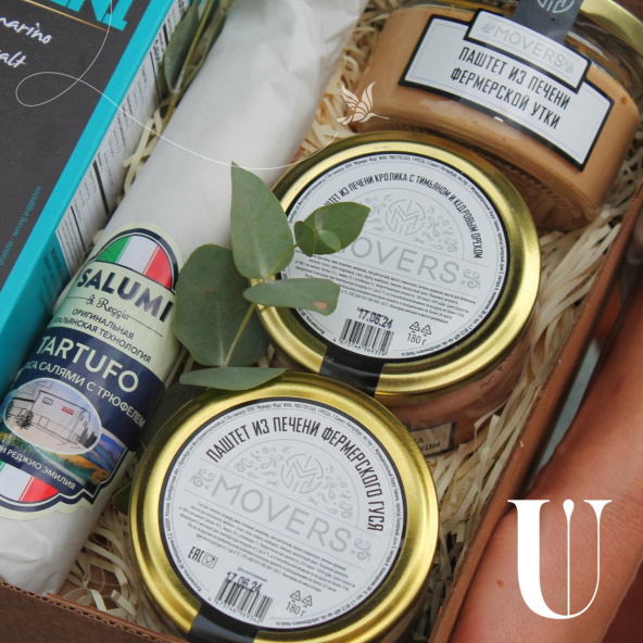 Упаковка - 1 шт. Коробка крафт - 1 шт. колбаса салями - 200 гр. палочки с морской солью - 125 гр. фермерский паштет из печени в ассортименте 180 г - 3 шт.