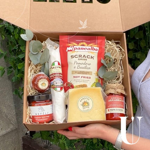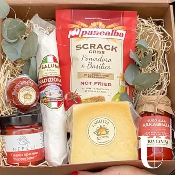 Подарочный набор из двух видов сыра, шоколада, оливок и колбасы салями