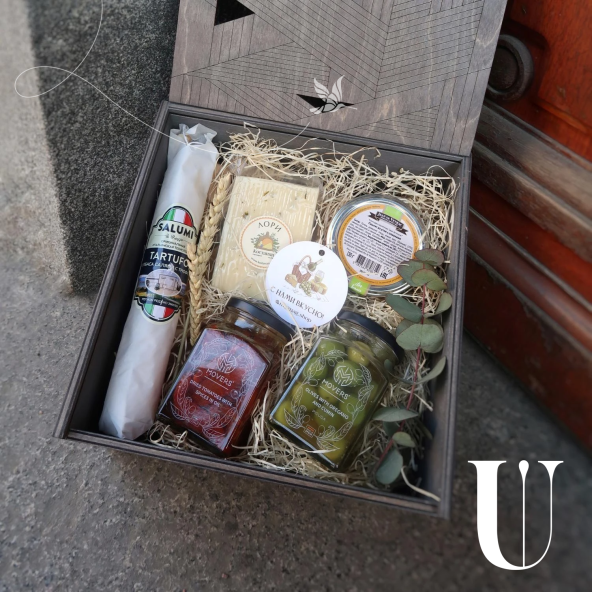 Подарочный набор из шоколада, сыра, паштета, красных перцев, оливок и салями в декоративном боксе
