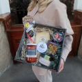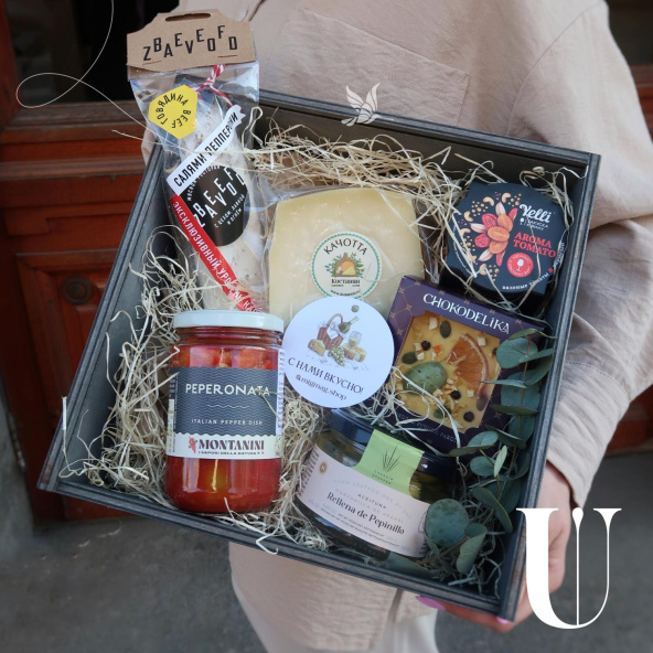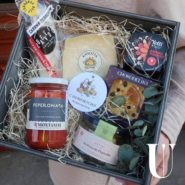 Подарочный набор из шоколада, сыра, паштета, красных перцев, оливок и салями в декоративном боксе