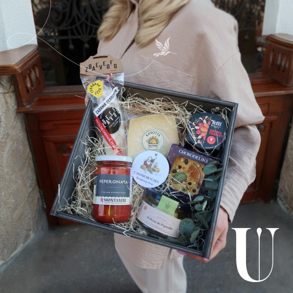 Подарочный набор из 5 видов сыра, меда, грецких орехов, фруктовой горчицы, оливок и горного чебреца