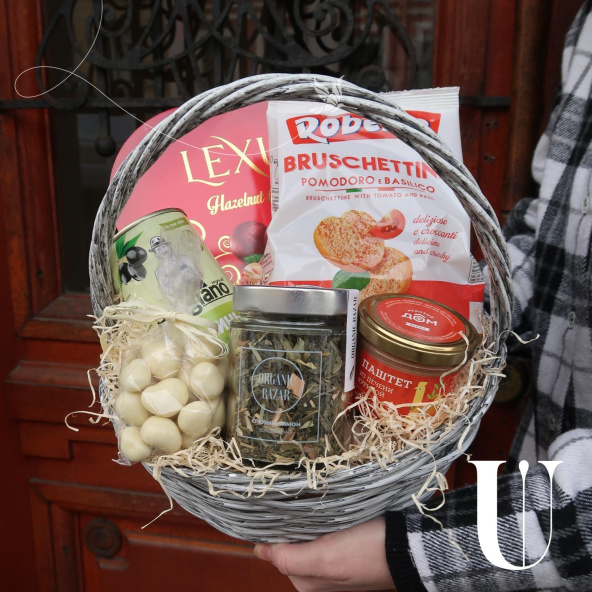 Подарочный набор в корзине из сыра с голубой плесенью, колбасы салями и оливок Ипосеа