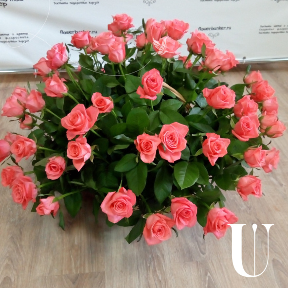 Композиция из одноголовых и кустовых роз, диантусов и эустом в корзине