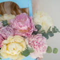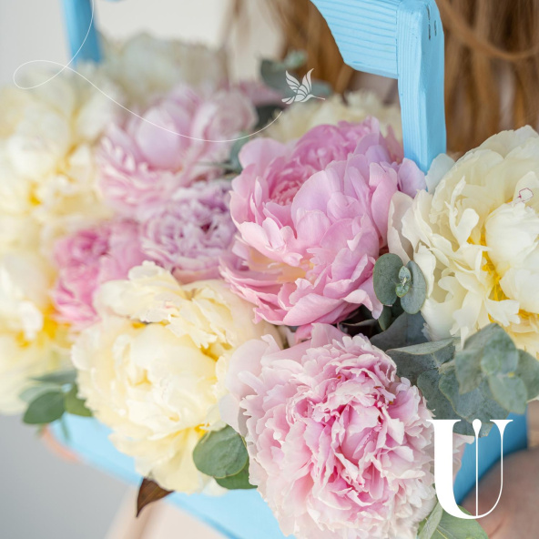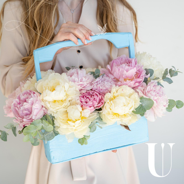 Корзина с пионовидными розами, лизиантусами, маттиолами и эвкалиптом