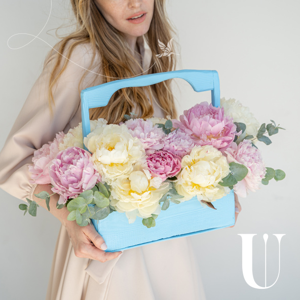 Корзина с пионовидными розами, лизиантусом и эвкалиптом