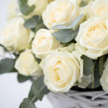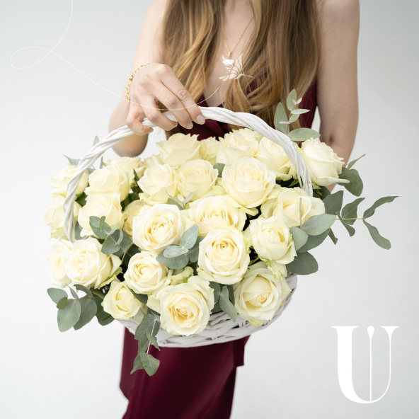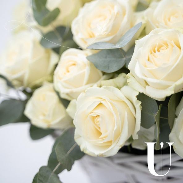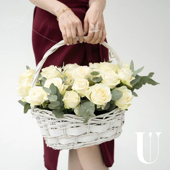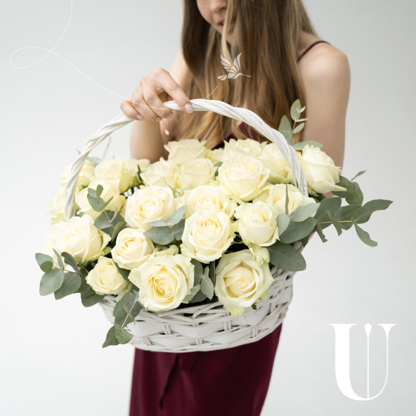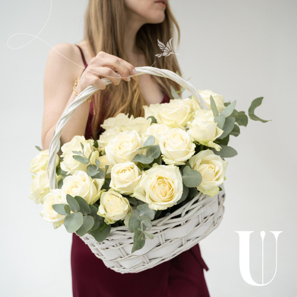 Цветочная композиция из белых гермини, роз Кахала и белых эустом в плетеной корзине