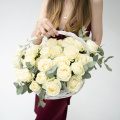 Композиция из одноголовых и кустовых роз, диантусов и эустом в корзине