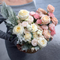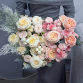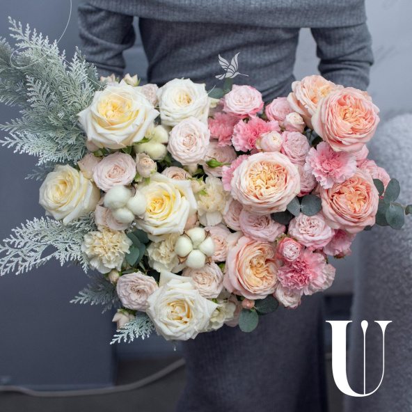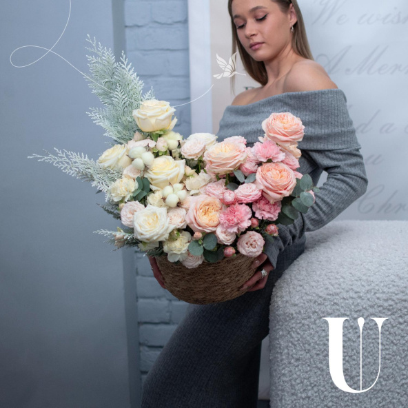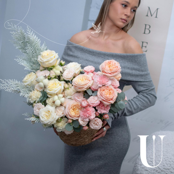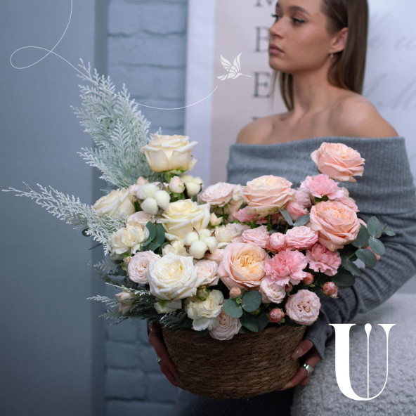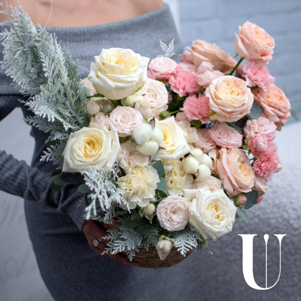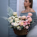 Большая корзина из Пинк Мондиаль, белых роз, кремовых диантусов и других цветов в корзине