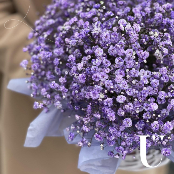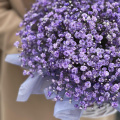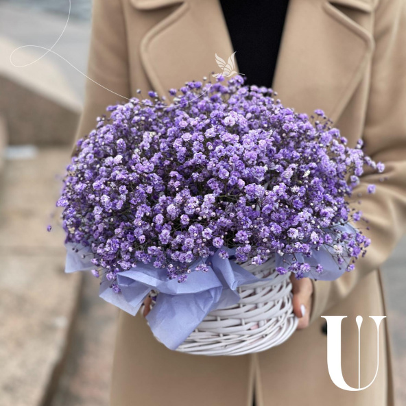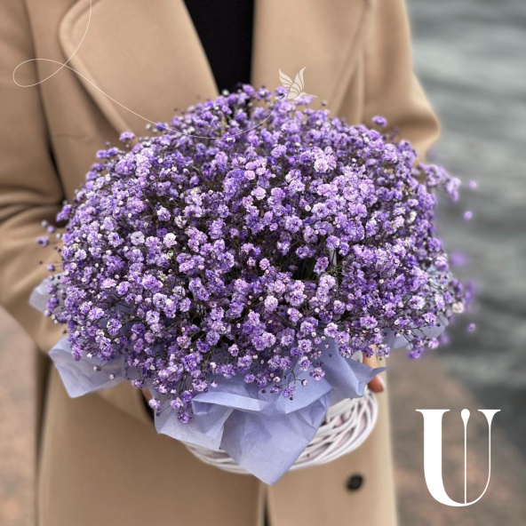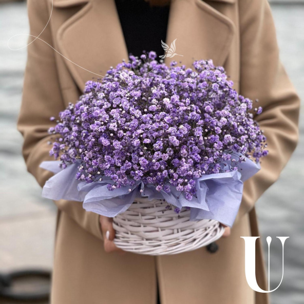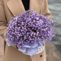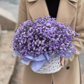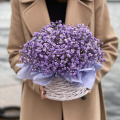 Яркая композиция из розы Эксплорер, кустовой пионовидной розы Бомбастик и фиолетовой эустомы в розовой сумке