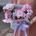 Композиция из розовых диантусов и розы в сумочке