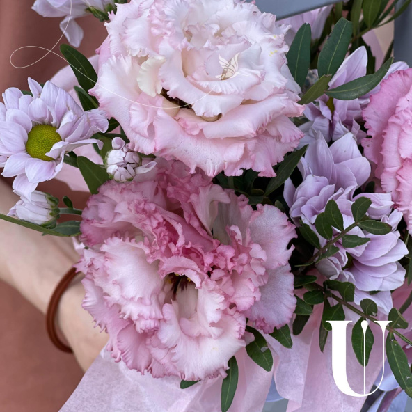 Композиция в розовых тонах из гермини, кустовых роз и лизиантусов для школьницы