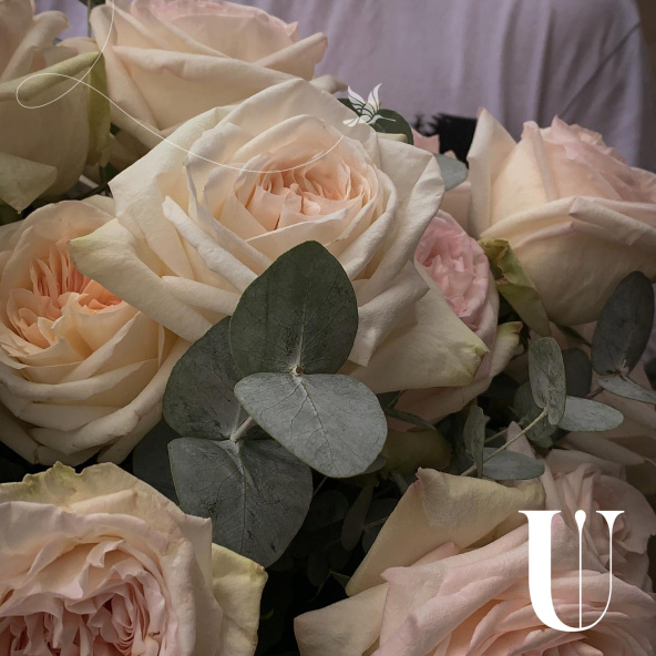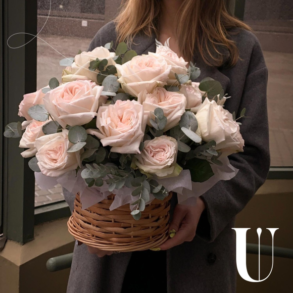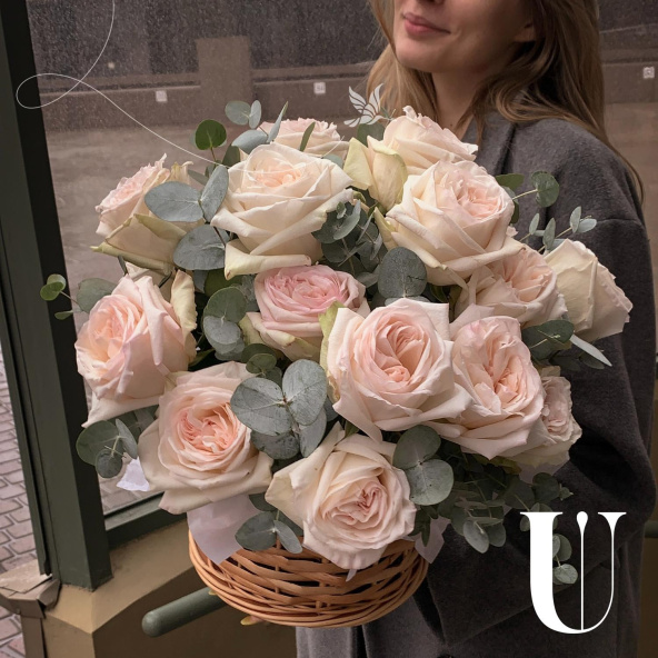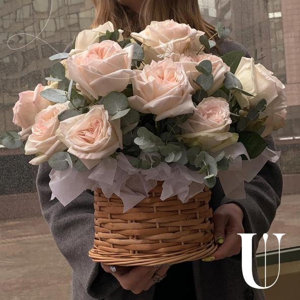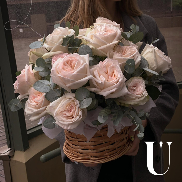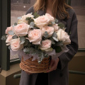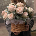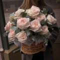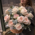 Большая корзина из Пинк Мондиаль, белых роз, кремовых диантусов и других цветов в корзине