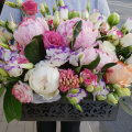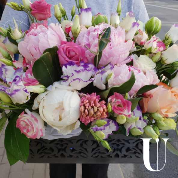 Пионы, гиацинты, лизиантус, пистация, тюльпаны, роза, деревянный-резной ящик, флористическая губка