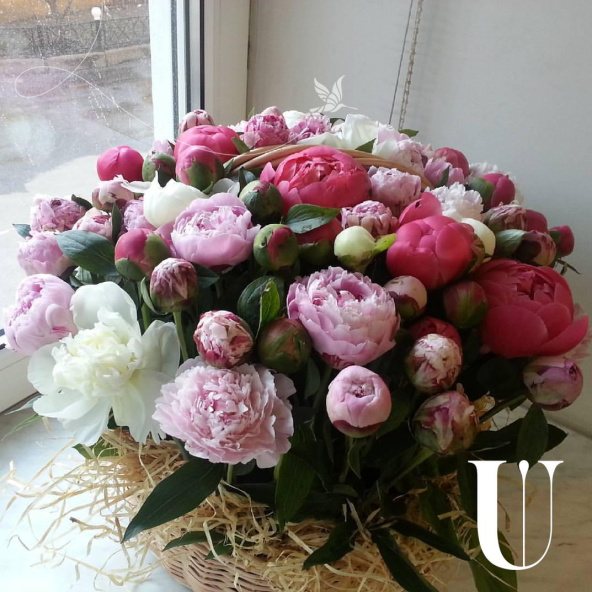 Упаковка (пленка с лентой), Пион 75шт., Пиафлор (оазис) 3шт., Корзина Лукошко д 40 см