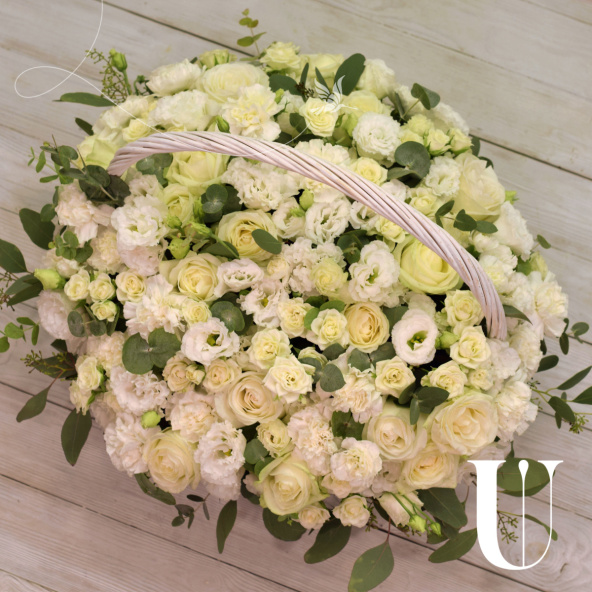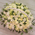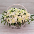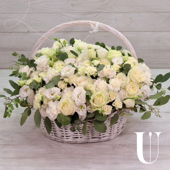 Роза белая - 17 шт., лизиантус - 11 шт., диантус 15 шт., кустовая роза - 10 шт., эвкалипт