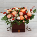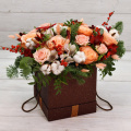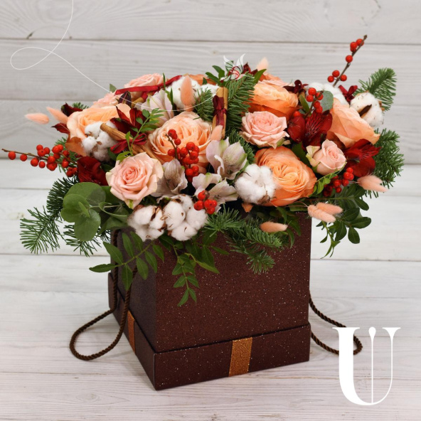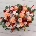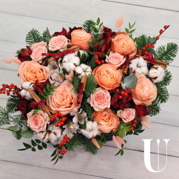 Роза Кахала - 7 шт., альстромерия белая - 3 шт.,. альстромерия красная - 3 шт., хлопок - 9 шт., роза кустовая Прана - 2 шт., ягоды илекс - 7 шт., корица - 4 шт., еловые лапки Нобилис - 2 шт., кремовый лагурус - 7 шт