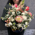 Цветочная композиция в розовых тонах и макаруни в подарочной коробке