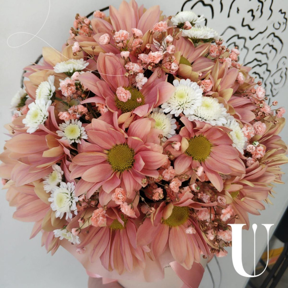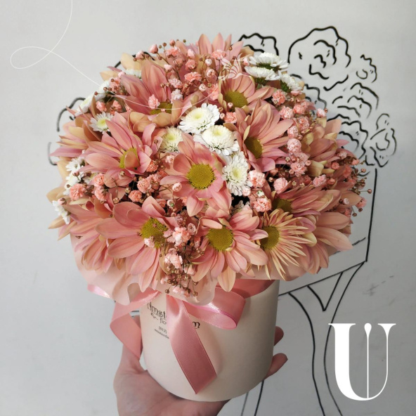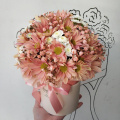 Мини-композиция из розовой гипсофилы в шляпной коробке