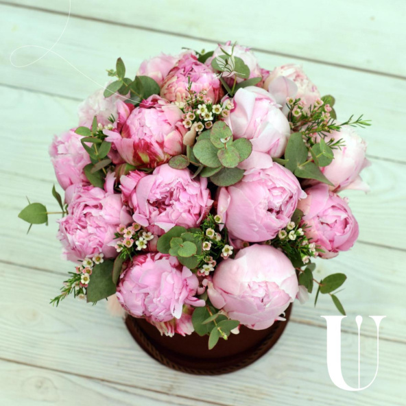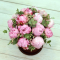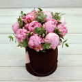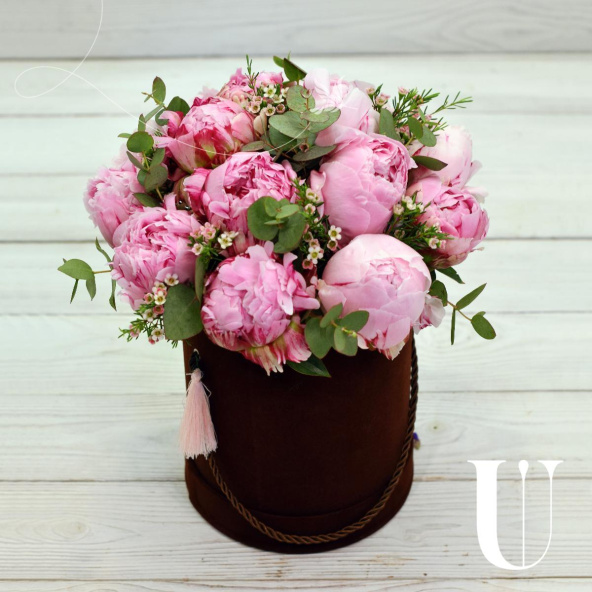 15 розовых пионов и эвкалипт в бархатной шляпной коробке