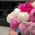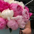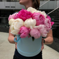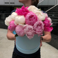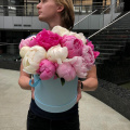 Композиция из роз Пинк Мондиаль, диантусов Пинк и белых эустом в розовой шляпной коробке