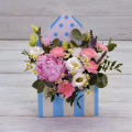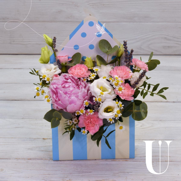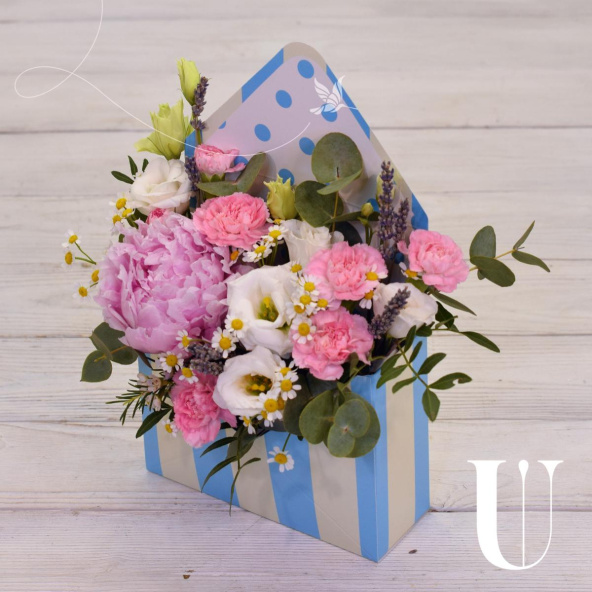 Пион - 1 шт., лизиантус - 3 шт., гвоздика кустовая - 2 шт., матрикария - 2 шт., лаванда, эвкалипт, фисташка