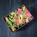 - Состав: Гвоздика (5), Роза кустовая (5), Эустома (Лизиантус) (3), Бруния силвер (2), Макаронс (6)