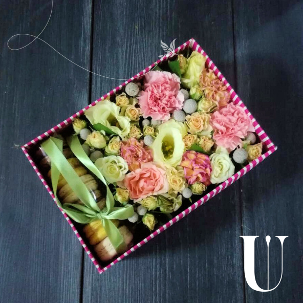 - Состав: Гвоздика (5), Роза кустовая (5), Эустома (Лизиантус) (3), Бруния силвер (2), Макаронс (6)