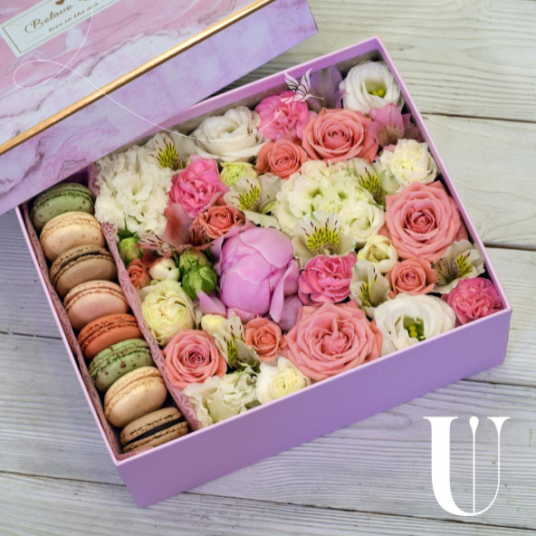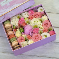 Картонная коробка с нежной цветочной композицией из пиона, лизиантусов, роз и альстромерий. Пирожные макаруни - 8 шт