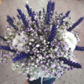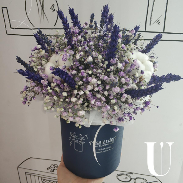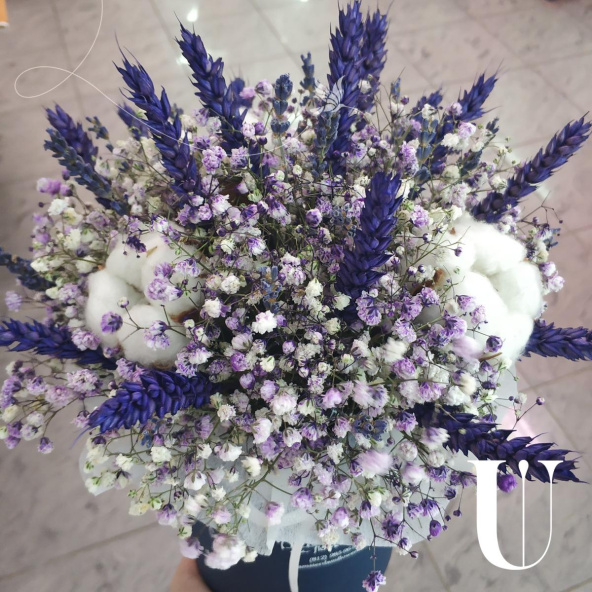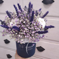 Композиция из 11 белых диантусов в голубой шляпной коробке