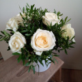 роза белая (9), фисташка, шляпная коробка 12*15 см белая, оазис.
