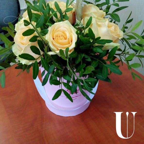 розы кремовые 9 шт, фисташка, коробка 12*15 розовая, оазис.