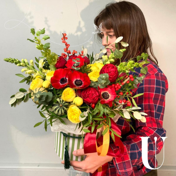 Состав: анемон 4, илекс 2, львиный зев 2, роза пионовидная 3, роза кустовая пионовидная 3, тыква 2, ирландский колокольчик 2, питоспорум 3, фисташка 3, эвкалипт 5