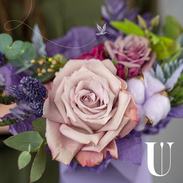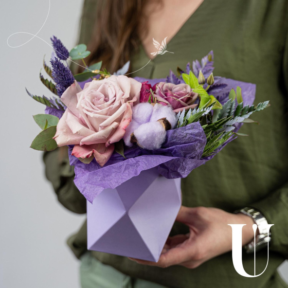 Коробочка с ромашковой хризантемой и лавандовой гипсофилой