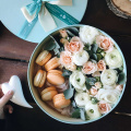 - 5 ранункулюсов, кустовая пионовидная роза, эустома, эвкалипт. В комплекте 6 пирожных макарони, их цвет может отличаться. Цвет и форма коробки может отличаться от фото. Мы уточним эту деталь, связавшись с вами после оформления заказа