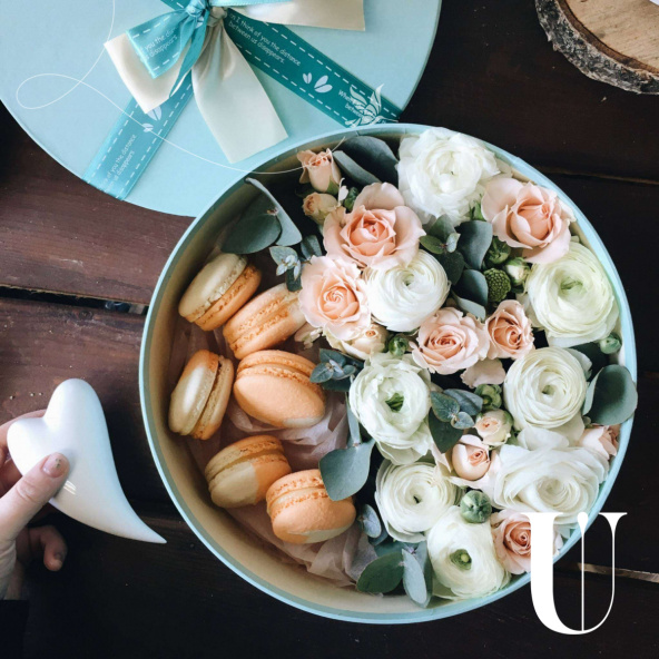 - 5 ранункулюсов, кустовая пионовидная роза, эустома, эвкалипт. В комплекте 6 пирожных макарони, их цвет может отличаться. Цвет и форма коробки может отличаться от фото. Мы уточним эту деталь, связавшись с вами после оформления заказа