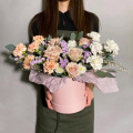 Нежная цветочная композиция из розы, тюльпанов и эустомы