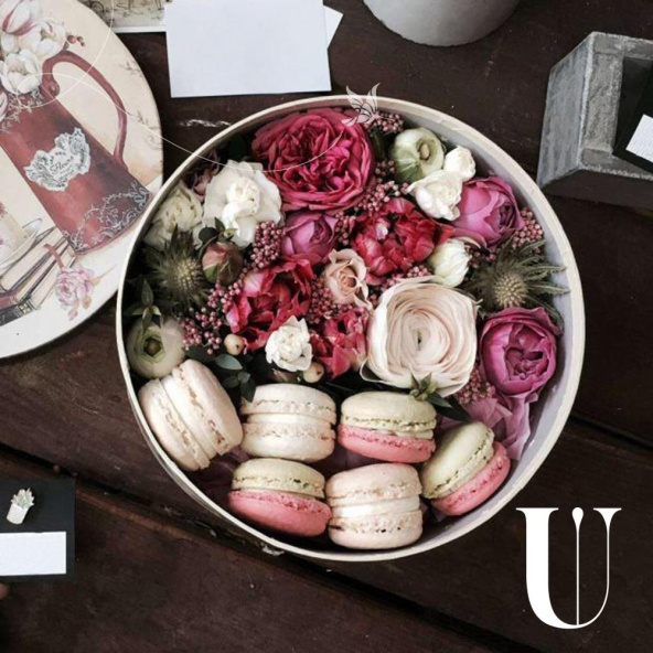 - Ранункулюс, кустовая пионовидная роза, ваксфлауэр, эрингиум, эвкалипт. В комплекте 6 пирожных макарони, их цвет может отличаться. Цвет и форма коробки может отличаться от фото. Мы уточним эту деталь, связавшись с вами после оформления заказа