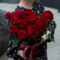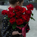Нежная цветочная композиция из розы, тюльпанов и эустомы