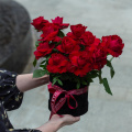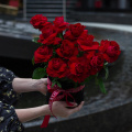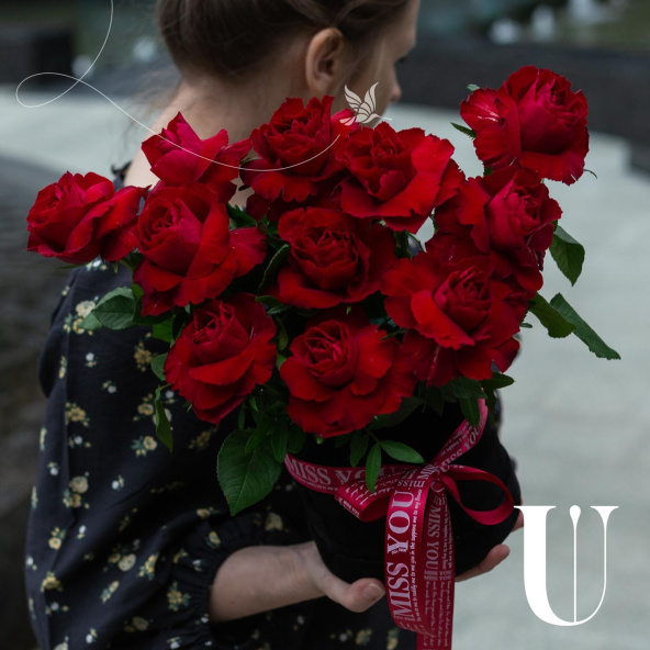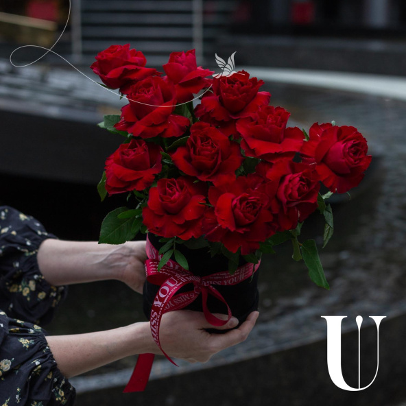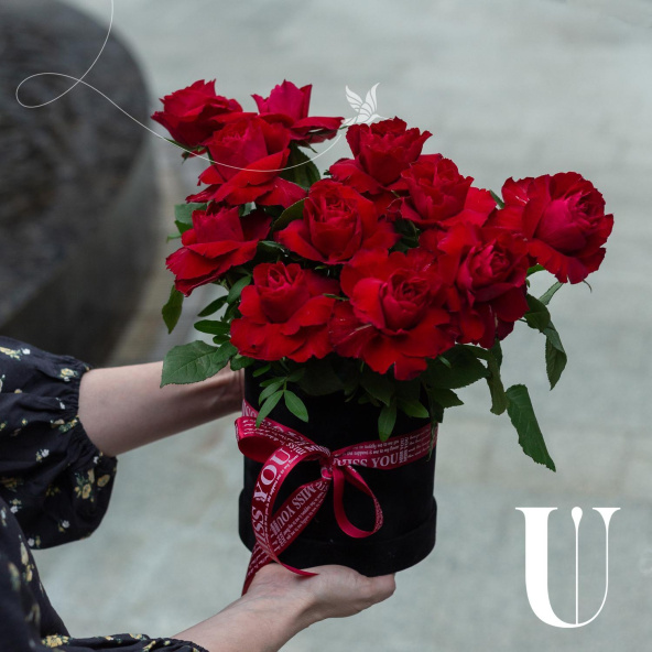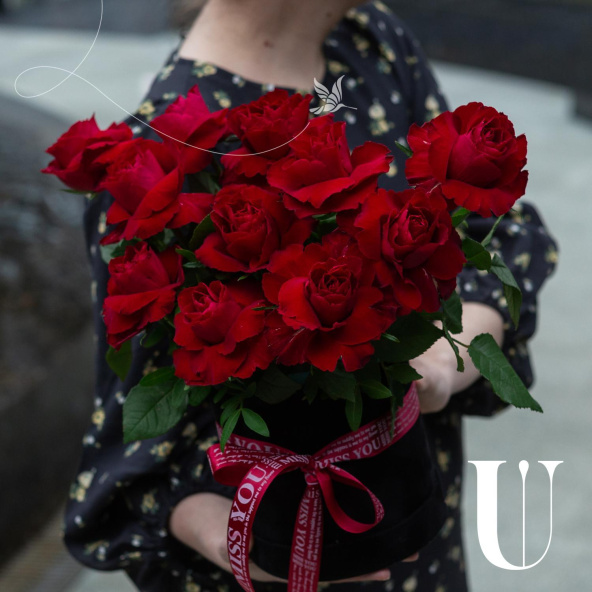 Композиция из роз тюльпанов и других цветов в шляпной коробке